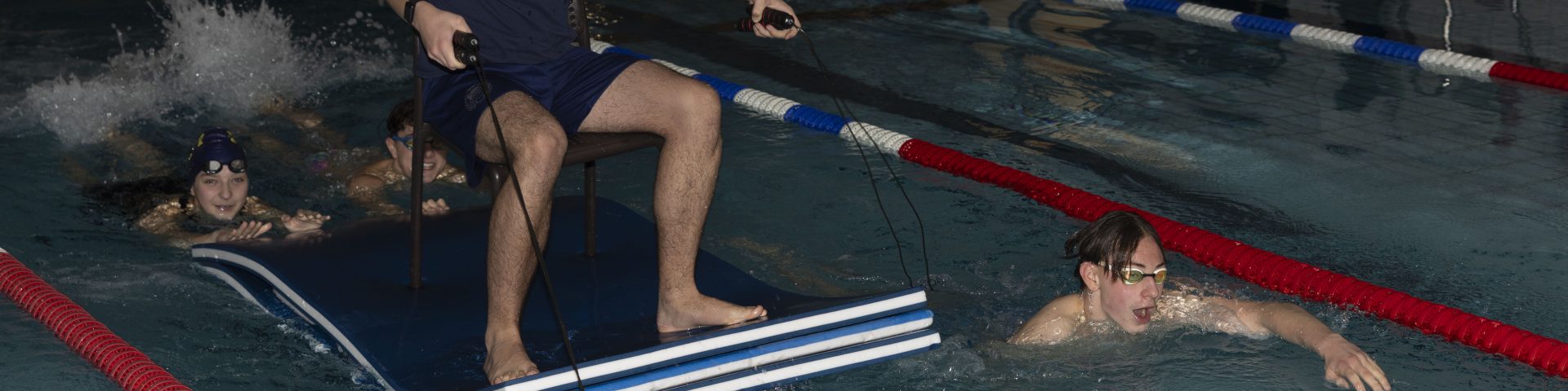 Besonders stimmungsvoll wurde es, als das Licht ausging, am Beckenrand 50 LED-Kerzen leuchteten und im Becken die Kerzenstaffel stattfand. Und plötzlich wurde es turbulent: 4 Helfer zogen den Weihnachtself durchs Wasser, damit er dem Weihnachtsmann helfen konnte, an die vielen, vielen Schwimmerinnen und Schwimmer ein kleines, sehr nützliches Geschenk zu verteilen.